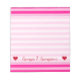 This notepad design features a pattern of alternating light pink and deep pink stripes. It also features a personalized name near the bottom, between heart shapes. [~Z0000006]