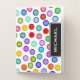 This pocket folder design features lots of circles/dots of various colors. It also features a customized name in white colored text within a dark colored area along the side of the front.