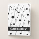 This pocket folder design features a pattern of various sized music notes. It might be appreciated by a musician, a composer, a singer, or somebody else who really likes music. It also features a personalized name in white colored text within a dark colored area on the front.