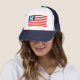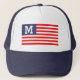 Custom name monogram patriotic American flag trucker hat for him or her. Make your own unique sun protection cap with personalized name initial letter. Red white and blue flag of America with monogrammed letter ie M. Customizable Fourth 4th of July / Independence Day party acccessories. USA pride design for men women and kids. Also handy for sports and outdoor activities.