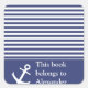 This book label has blue and white stripes. At the bottom is a white ship's anchor. The book plate sticker says ' This book belongs to'. You can personalize the book label with the recipient's name.