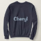 This is a Navy Blue Women's Basic Sweatshirt. The navy blue sweatshirt is customized with a woman's name, Cheryl. The name is a Chambray Comfort Color light blue color. The name Cheryl is on the front and back of the sweatshirt. You can replace the name by clicking the Personalize link. The sweatshirt fits true to size. The sweatshirt is a cotton polyester blend. The sweatshirt has set-in sleeves and double-needle stitched neckline, armholes and bottom band for long-term durability. The fabric is imported. The fabric care instructions are machine wash cold and tumble dry low.