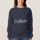 The navy blue sweatshirt is customized with a woman's name, Collette. The name is a Chambray Comfort Color light blue color. The name Collette is on the front and back of the sweatshirt. You can replace the name by clicking the Personalize link. The sweatshirt fits true to size. The sweatshirt is a cotton polyester blend. The sweatshirt has set-in sleeves and double-needle stitched neckline, armholes and bottom band for long-term durability. The fabric is imported. The fabric care instructions are machine wash cold and tumble dry low.