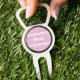 Three functions, one personalized piece. This soft pink combo tool features a custom name or monogram (up to ten characters) in crisp white script framed by a clean double border on a removable ball marker. The tool includes a built-in bottle opener and divot repair edge—perfect for gifting, coordinating with your gear, or adding flair to a bachelorette golf outing. Part of our bestselling layout, now reimagined in pink to match our towel, glove, water bottle and more.