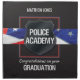 A police badge frames the words - Police Academy. Set on a black background, the words stand out to congratulate an officer on their graduation. A flag banner is seen behind the badge with a grunge look on the words and the flag signifying the grit and hard work of a law enforcement officer. Send best wishes and congratulations to the new police officer on their graduation from Police Academy! You can customize the name on this one for that personal touch.