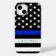 A custom name police flag iPhone case. It features a cropped thin blue line police-themed American flag. In between the lines is a spot for your name or your gift recipient's name. Bold and vibrant and a way to show your love for the country and us law enforcement.