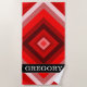 This beach towel design features a pattern of nested square shapes colored various shades of red. It also features a personalized name in white colored text within a dark colored area on the front. [~Z0000000]