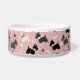 Cute black, gray and wheaten Scottie dogs wearing bows, with pawprints and dog bones on a pink background dog bowl with your own custom pet name.