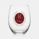 Custom name wine glass is shown with a winner's gold wreath print with a sample initial and name.