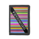 This wallet design features an eyecatching pattern of stripes (or lines) of various colors. It also features a custom name in white colored text within a dark colored area, with both at an angle. [~Z0000058]