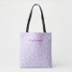 This stylish tote bag features a light purple background adorned with a pattern of white outlined hearts. The bag is customizable with any name, making it a perfect personalized gift or accessory. The name "Morgan" is displayed in pink, stylized text, adding a unique touch to the design. The black handles provide a comfortable and sturdy grip. Ideal for everyday use, shopping, or as a thoughtful gift for friends and family.