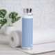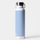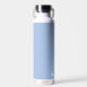 This insulated water bottle is shown in white with a periwinkle blue accent color and a custom name sample.