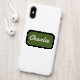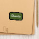 Your name or text in a retro script font. Default colors are white text on an olive green background but this can be changed in the design tool.