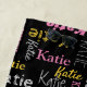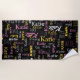 Typographic short personalized name text warm yellow, pink, gray, and white on a black background towel. Background color can be changed if required. Personalized graphic text personalized design ideal for making sure you mark your sunbed or don't lose your towel around the pool. Personalize with your own short name, currently reads Katie for help with personalization and other name lengths please contact me. Designed by Sarah Trett for www.mylittleeden.com only on Zazzle.