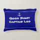 This navy blue accent pillow has a white anchor at the top. Under the anchor, you can be personalize the navy blue pillow with your text (shown: Good Night Captain Leo). The back has a pattern of white boat anchors.