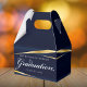 These elegant navy blue and gold graduation party favor boxes features modern geometric lines around your formal text. The classy white script details your graduate school and class information. This upscale box is perfect for a Class of 2026 college or university grad.