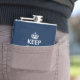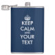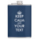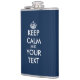 Custom navy blue keep calm big drink flask. Personalized hip flask with funny quote. Nautical colors. Fun Christmas or Birthday gift idea for sailor, captain, groom, dad, husband etc. Customizable into any color. Large and small sizes.