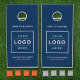 A polished, professional look for your brand — this custom business logo cornhole set features a rich navy background with white text. Both boards display your company name above a clean logo placeholder, with space for your location, slogan, or website below. Upload your logo in any color or shape and customize all text fields to match your brand. Cornhole bag colors shown are orange and gray and can be modified. An impressive branded yard game for corporate picnics, team building events, trade shows, and company parties.