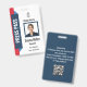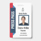 Professional red and navy press ID badge with space for your photo, name, title, company logo, and barcode. Perfect for media, journalists, photographers, event staff, and corporate press passes. A customizable template for news, production crews, and special events.