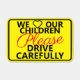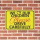 Heavy duty rust resistant aluminum outdoor sign template. all three text boxes are editable using the personalization tool. it presently reads "WE ❤︎ OUR CHILDREN PLEASE DRIVE CAREFULLY"