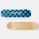Skateboard with fun funky black and bold bright azure sky blue colored racing flags check pattern design. Stylish original and cool cover for the trend-savvy and art-loving hip trendsetter, trendy look style motif lover.