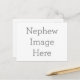 Keep in touch with your nephew by sending Zazzle custom postcards! Add your favorite image, photo, or artwork to a blank postcard, or simply say 'hi' by adapting a pre-existing design. It's also a good way to save paper, since you can send a note without wasting an envelope! Designing a one-of-a-kind postcard is a simple task, so click on 'Add Image' or 'Add Text' to try it out for yourself.