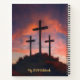 Personalize your 2024 Notebook featuring Jesus and a lion against a sunset backdrop with three crosses. Enjoy full text customization on both the front and back covers, allowing you to include your name at the top, your favorite scripture, and the notebook name and year. Crafted for you by Infinity Digital Art.