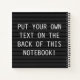 Customize this notebook both the front and back with your text. This has options to choose what type of paper you want inside and what color you would like the spiral binding.