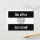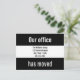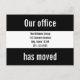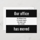 This black and white postcard has three fields. Together the black fields say ' Our office has moved'. Use the white field to customize your postcard with your company's name, address and phone number.