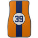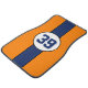 Custom car floor mats in orange and blue sports color scheme. Customize by adding your favorite number or initial(s). Bold stripe floor mats in blue and orange color combo with black outline.