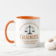 This custom law school graduation mug gift features modern orange typography for a class of 2024 graduate. Customize with your graduating year under the scales of justice for a great personalized lawyer keepsake for a graduating attorney.