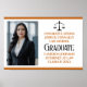 This custom orange law school photo graduation party poster features modern typography for a class of 2024 graduate. Customize with your graduating year under the scales of justice for great personalized lawyer decor for a graduating attorney along with a student photograph.