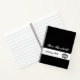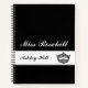 Custom notebook is shown in a black color with an accent strip with a Miss America style crown print and a queen's title and name sample.