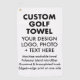 Custom personalized 16" x 24" Golf Towel. Design, create, make your own personalised polyester blend microfiber, machine washable Golf Towel with Grommet and brass-plated hook from a blank template. Customize the front of the towel, edge-to-edge print, with your logo, photo or design, and add text. A great customizable, personalized gift for golfing fans, for Christmas, a birthday or other special occasion. Add your logo and branding for a members' golf or country club, sports facility, school, hotel, health club, or for a corporate gift.