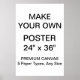 Custom printed personalized 24" x 36" PREMIUM CANVAS POSTER Blank Template. Design, create, make your own. Your photo, image, text, logo, graphics in edge-to-edge full color print. PREMIUM CANVAS is made from an additive-free cotton-poly blend that is fade-resistant for 75 years and is recommended for photography or fine art and features special ink-receptive coating to protect printed surface from cracking when stretched. Best for college dorm and teenage bedroom decor, and for Christmas and birthday gifts.
