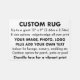 Design, create, make your own customized rug with a photo, image, logo, pattern or design, and add text. The perfect personalised way to uniquely decorate your lounge or bedroom, and also makes a wonderful customizable home decor gift for a new home, Christmas, a birthday, nursery or kids room, wedding, or other special occasion. Add your logo and branding for a coffee shop, restaurant, hotel or bar. Also great for the company office, a business expo or corporate event. Choose the 'outdoor rug' version for a fair, garden party, marquee event, porch, patio or pool area. Choose from 8 size and shape options: 3' x 2', 5' x 3', 6' x 4', 7' x 5', 10' x 8', 12' x 9', 8' x 2.5' (Runner), or 5' diameter round rug.