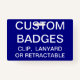 Custom printed personalized 3.38" x 2.13" BADGE Blank Template (with NAVY BLUE Background - change to any color). Design, create, make your own. Your photo, image, text, logo, graphics in full color edge-to-edge print on the front and the back - horizontal or vertical designs. Made of PVC plastic, durable, won't fade or tear. Available with Lanyard, Metal Clip, Retractable Clip, or Badge Only.