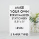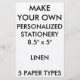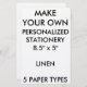 Custom printed personalized LINEN PAPER STATIONERY Blank Template - 8.5" x 5.5". Design, create, make your own. High quality, full color, full bleed printing in portrait or landscape. LINEN: 70lb text-weight, elegant paper with a beautiful textured surface of embossed laid lines. Evoking mold-made letterpress papers, it's perfect for your most formal occasions. Five paper type options: Basic, Recycled, Felt, Linen, and Speckled. Best for personal letters and correspondence with personal monogram and contact details, for the office with business logo etc, and as supplement writing for Wedding, birthday and Christmas cards.