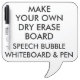 Custom printed personalized SPEECH BUBBLE DRY ERASE BOARD (WHITEBOARD) WITH BLACK DRY ERASE PEN & HOLDER Blank Template - 10" wide x 10" high x 0.25" thick (you can opt not to preattach pen holder to board). Design, create, make your own. Your photo, image, text in vibrant full color high definition AcryliPrint HD print process on the entire front of the board. Choose from 8 styles of Dry Erase Board (Whiteboard) with 4 different kinds of backing options for easy mounting on any surface - 3M command strips, Adhesive, Magnetic or None (keychain holder versions have only screwholes for mounting). Best for setting office, business and home reminders, shopping lists, hanging by the front door or in the kitchen, and for Christmas gifts.