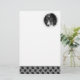 Custom pet photo template design with black paws on gray. The custom photo is placed in the top corner and it is shown through a round shape that creates an uneven edge to any image. Replace the sample photo with your own image. The bottom has a gray color stripe with a pattern of black dog paw prints.