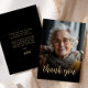 The front of this 80th birthday invitation features the guest of honor's photo with the words "thank you" in elegant gold-colored calligraphy script overlay. A dark screen helps make the text pop. Customize the reverse side with your personal message in gold-colored sans serif font and your name in script on a black background.