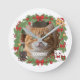 Keep track of the time in the most festive way with this adorable customizable wall clock! The clock features a vibrant Christmas wreath frame, complete with green pine boughs, red bows, holly berries, and charming little kawaii cats wearing Santa hats and sitting amongst Christmas lights and presents. The center of the clock allows you to display your favorite photo—perfect for showcasing your beloved cat, dog, or family picture—along with a customizable space for a pet's name (like "TOMMY") or a short holiday message. This unique, personalized timepiece makes a wonderful Christmas gift or a cute addition to any cat lover's holiday home decor.