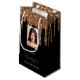 A gift bag for a girly and glamorous 21st (or any age) birthday. An elegant black background with faux gold glitter drips, paint dripping look. The text: The name is written with a modern golden hand lettered style script. Tempate for a date and age 21. Personalize and add your own photo of the birthday girl. Can be used both for gift wrapping or as a party favor bag.