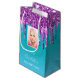 A gift bag for a girly and glamorous Sweet 16, 16th (or any age) birthday. A teal, blue gradient background with purple and pink faux gold glitter drips, paint dripping look. The text: The name is written with a modern white hand lettered style script. Tempate for a date and age 16. Personalize and add your own photo of the birthday girl. Can be used both for gift wrapping or as a party favor bag.