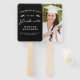 Help your graduation guests keep cool during the ceremony or party with these custom photo graduation hand fans, featuring the words "Congratulations to our Graduate" in white text on a black background. The word "Graduate" appears in a graceful handwriting-style script. A pair of gold faux glitter mortar board caps and a scattering of gold confetti decorate the top portion of the label. Personalize one side with your grad's name, school, and year of graduation. Easily replace the sample image on the other side with a photo of your grad.