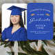 Help your graduation guests keep cool during the ceremony or party with these custom photo graduation hand fans, featuring the words "Congratulations to our Graduate" in white text on a blue background. The word "Graduate" appears in a graceful handwriting-style script. A pair of gold faux glitter mortar board caps and a scattering of gold confetti decorate the top portion of the label. Personalize one side with your grad's name, school, and year of graduation. Easily replace the sample image on the other side with a photo of your grad.