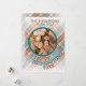 Unique, classic, cute and decorative Holiday season greeting card. With fun Happy Thanksgiving wish on a cozy warm colorful teal blue and orange red colored plaid tartan pattern. With rustic wood looking open bauble ornament to customize or personalize with your own cheerful photo, and your names or family name above it.