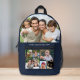 A custom photo collage dark navy blue backpack for that perfect gift. Personalize with 7 photos of family, pets, memories, events, your photography, etc. and add a line of text in simple white typography. The colors of the background and text can be changed by editing in the design tool.