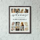 Elegant graduation welcome poster sign featuring a simple white background that can be changed to any color, a 11 photo collage of the graduate, the word "welcome" in a calligraphy script font, their name, and the class year.