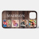 Create your own personalized 4 photo collage phone case with your custom images on a rustic dark brown farmhouse style wooden plank background. The design also features your name or monogram. Add your favorite photos, designs or artworks to create something really unique.